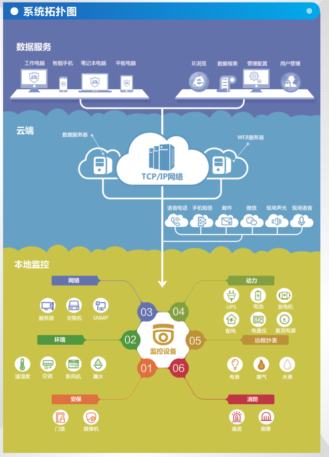 云监控平台从云端监控机房,将原本分散的数据中心设备设施管理,进行统一化,标准化,减轻数据中心用户的值班压力,和运维成本,提高运维效率,为数据中心提供全面的基础设备设施监控及其维护服务,大幅提高数据中心设备运行的安全性。